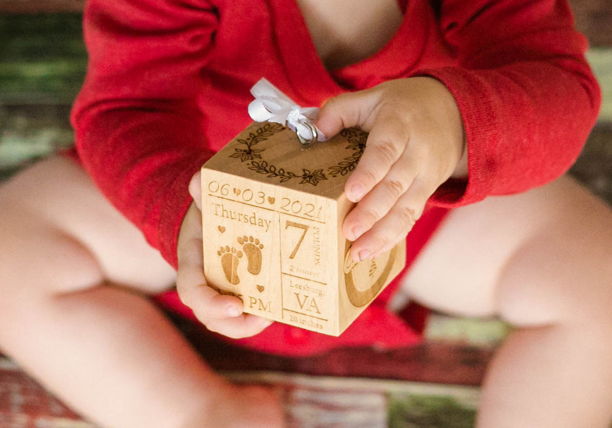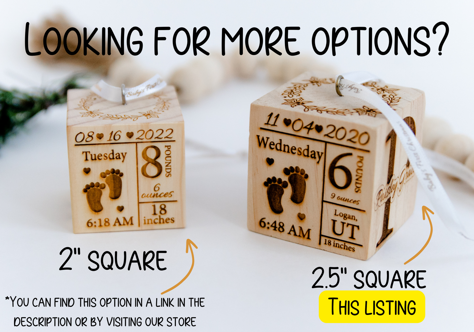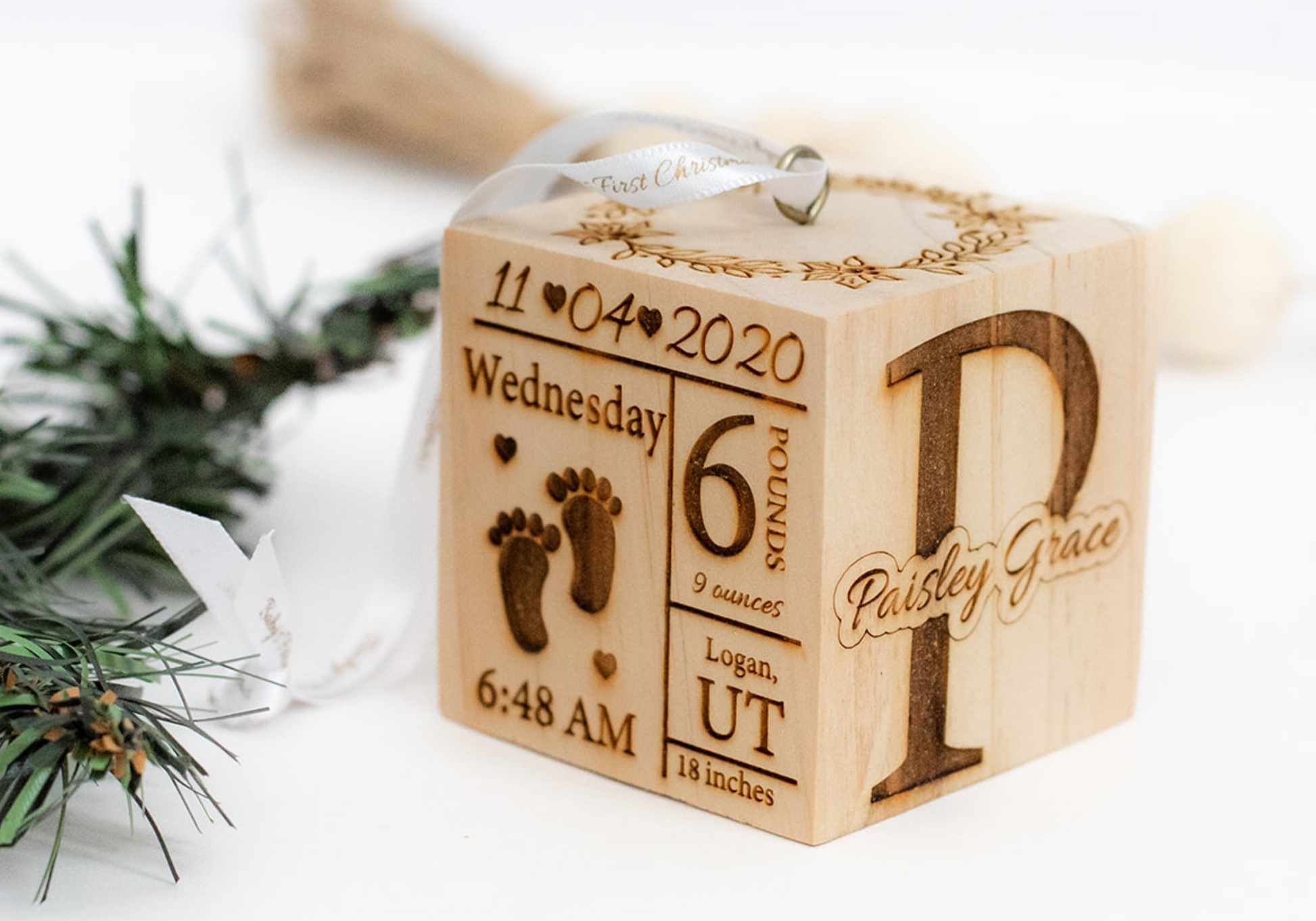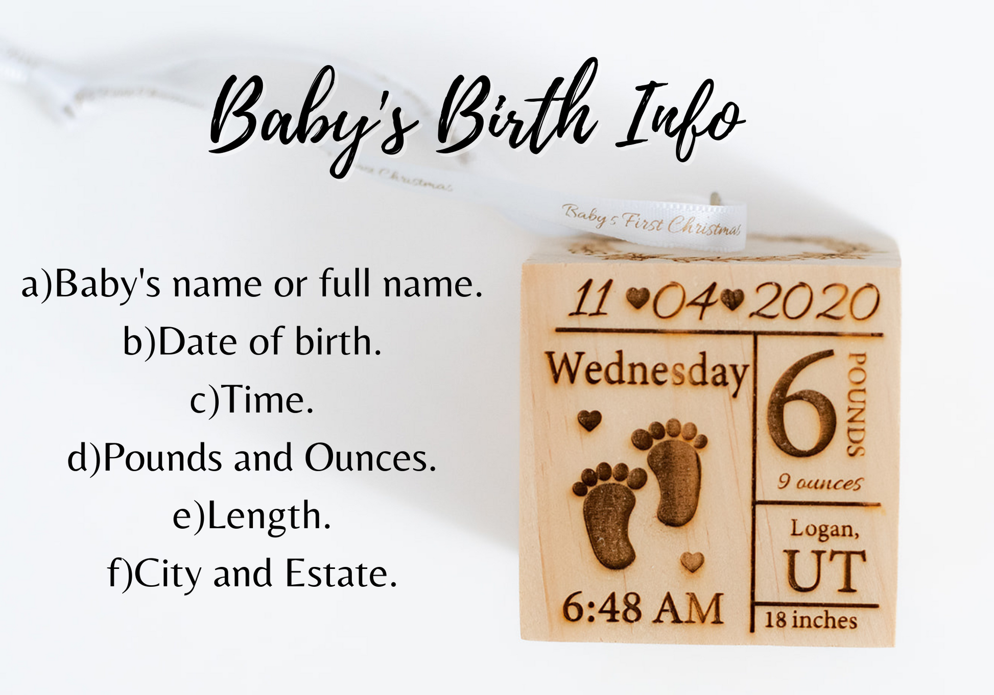 This wooden block is engraved with your choices from our many options, and personalized with the baby's name and birth info. It comes with a ribbon loop for hanging on the tree or as decoration in the nursery.