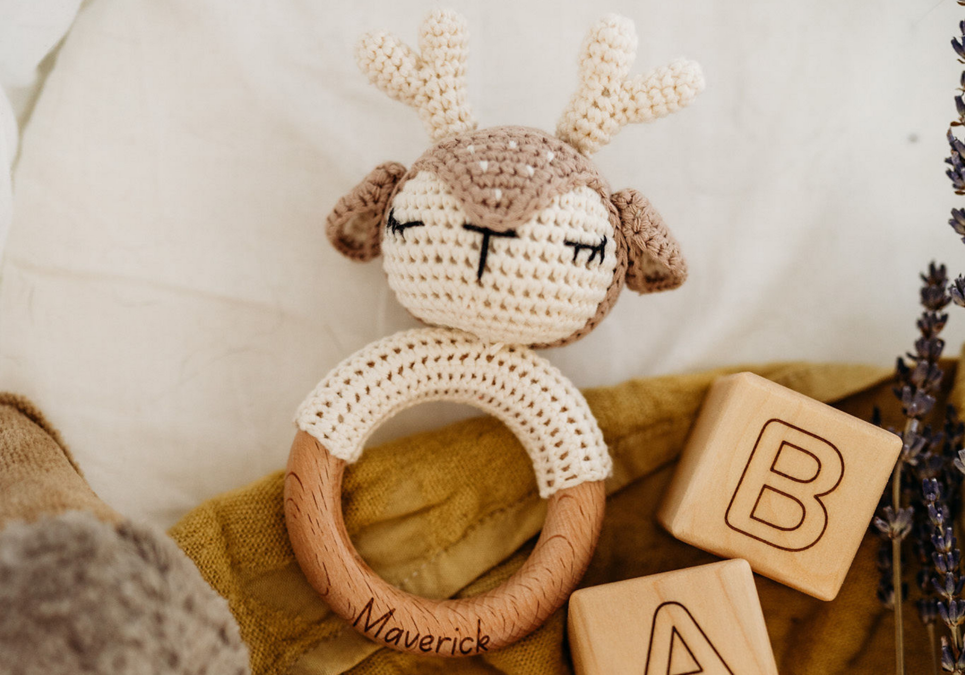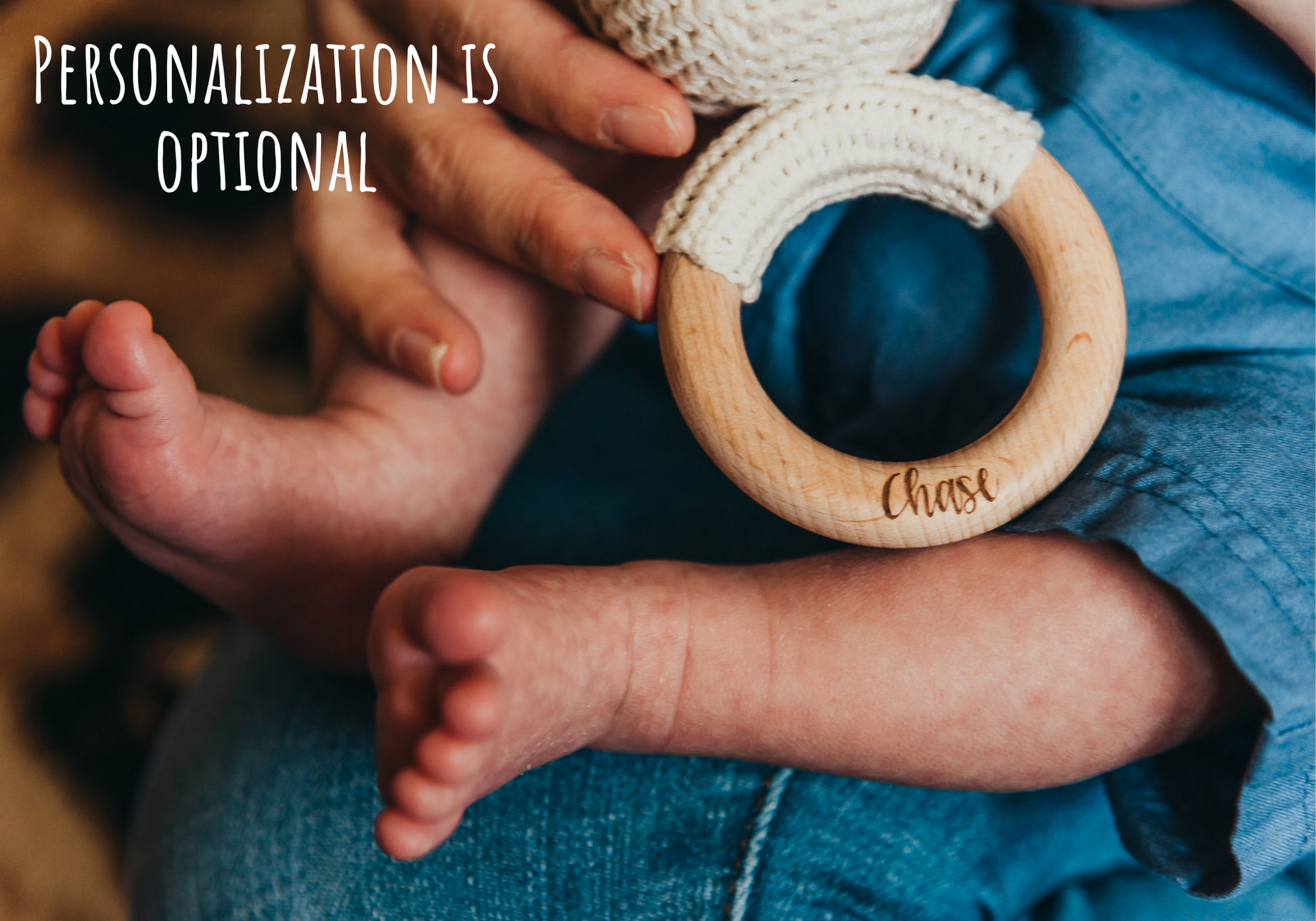 Personalization on the rattle is optional, if you choose this option Baby's Name will be engraved on the wooden ring of the crochet toy. Make sure to add the personalization info in the notes of your order at the checkout (name must be shorter than 15 characters).
