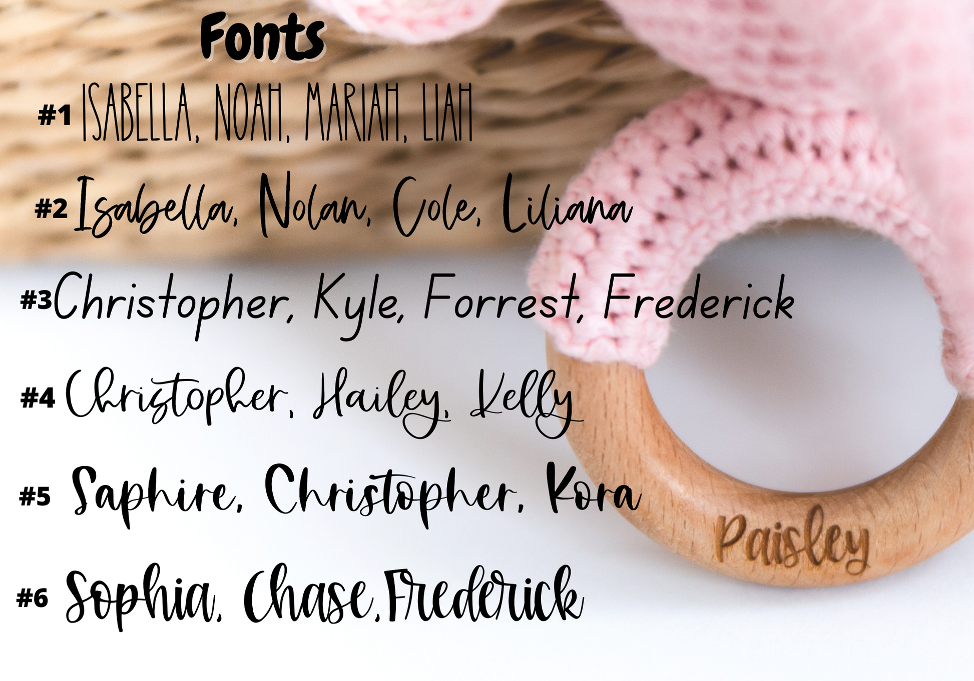 Baby's name will be engraved on the wooden ring of the rattle toy, please enter the #font and the name or word for the personalization. This option is optional if you don't wish to add a personalization enter N/A.