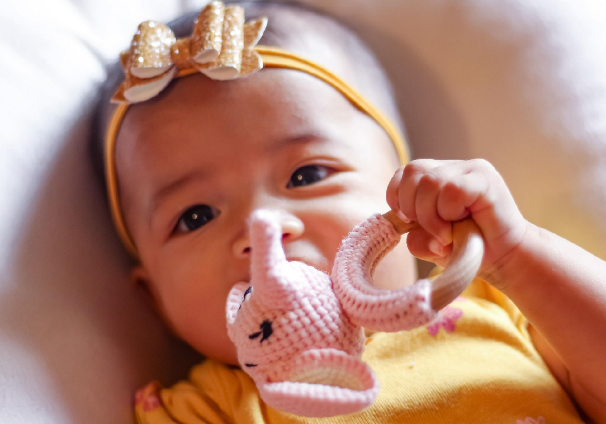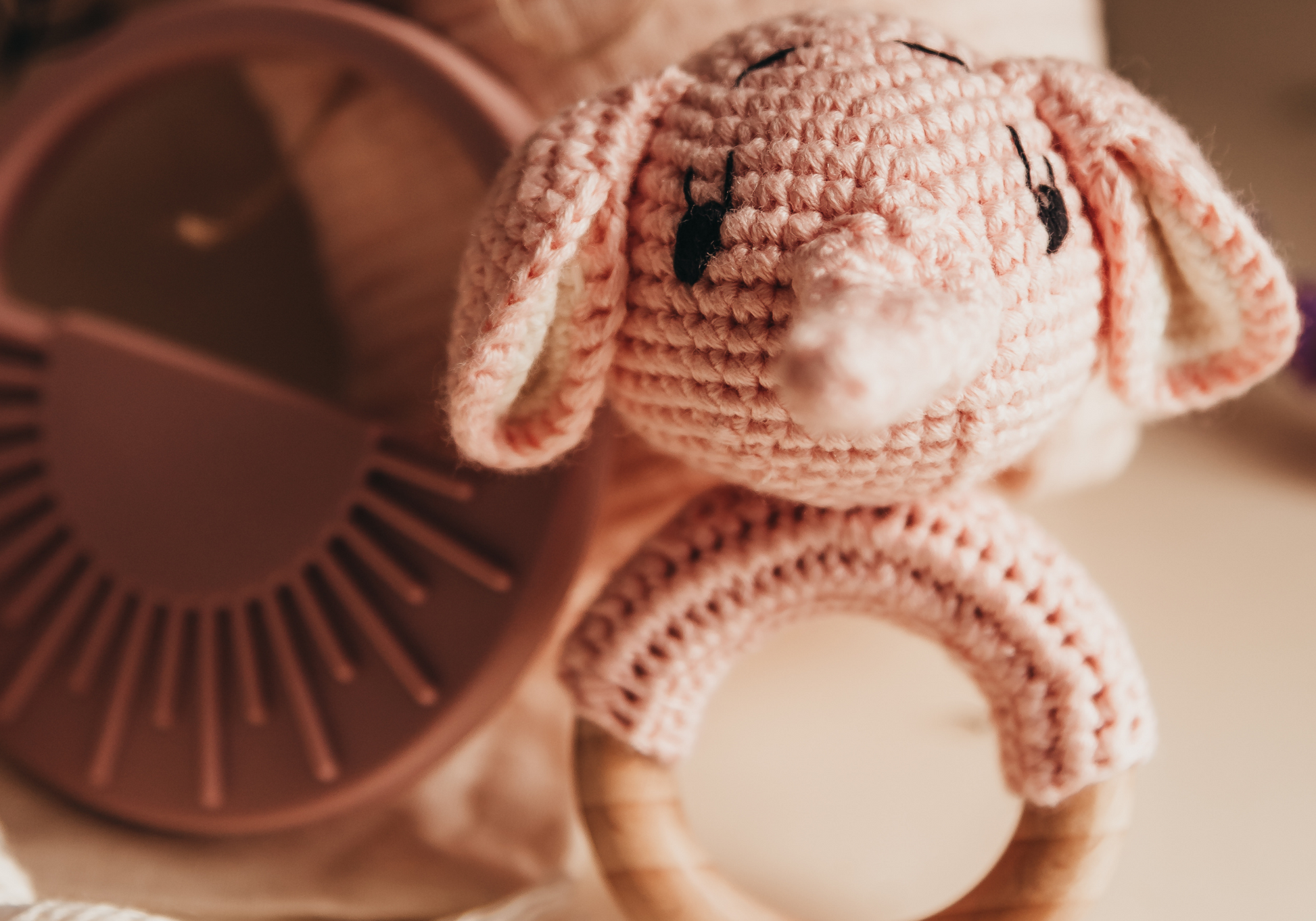 2- A unique and handmade elephant crochet teether rattle, made with 100% organic baby yarn and personalized with the baby's name engraved on the wooden ring.