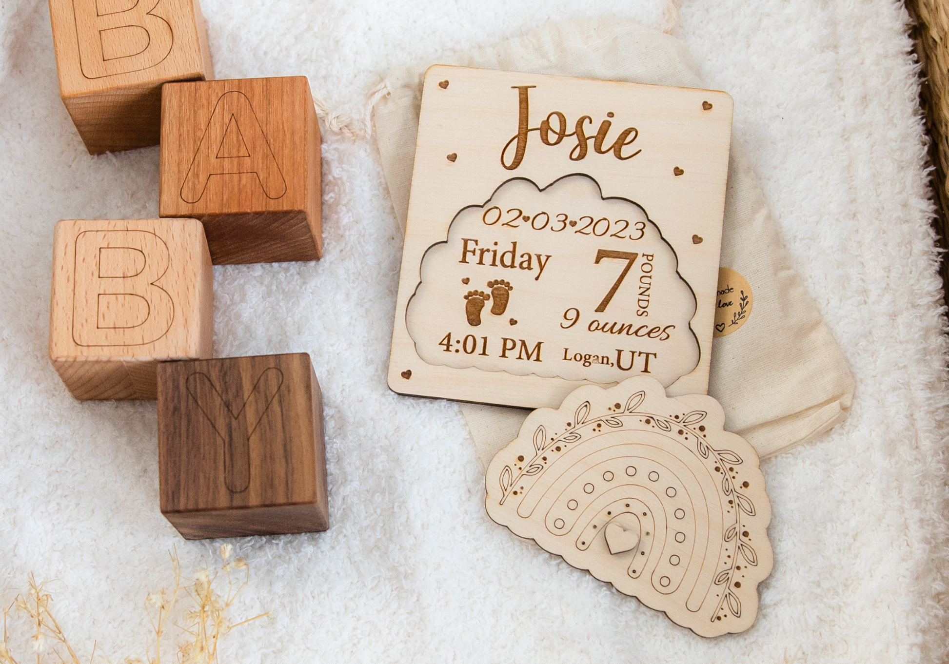 It is customizable, with the baby's name beautifully engraved on the outside of the puzzle. Inside, the puzzle displays the baby's birth stats information, such as their birthdate, weight, and length.